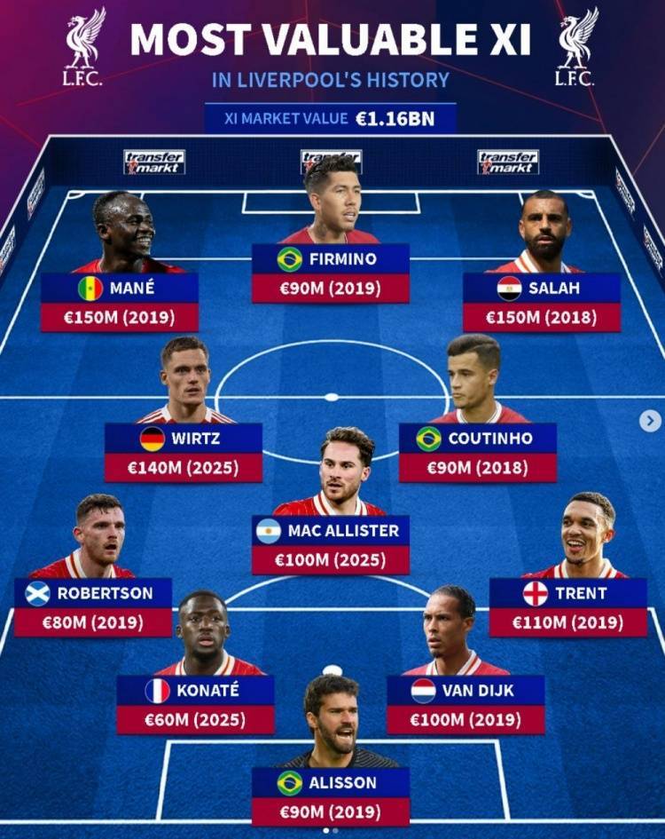马内(2019年,1.5亿欧)、菲尔米诺(2019年,9000万欧)、萨拉赫(2018年,1.5亿欧)