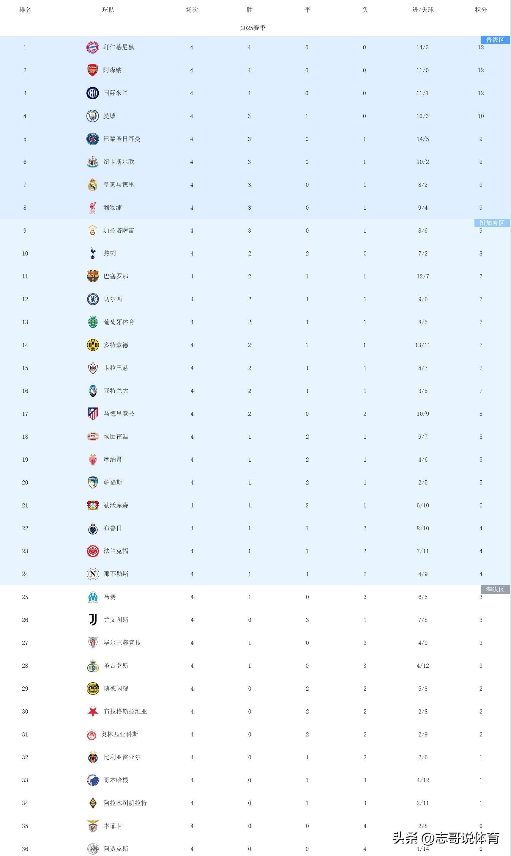 4轮过后的积分榜方面,拜仁、阿森纳、国际米兰取得了全胜的战绩,位居积分榜前三位,本菲卡和阿贾克斯4连败一分未得、排名后两位。欧冠